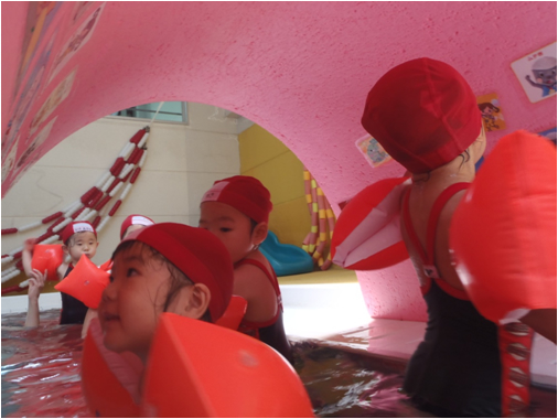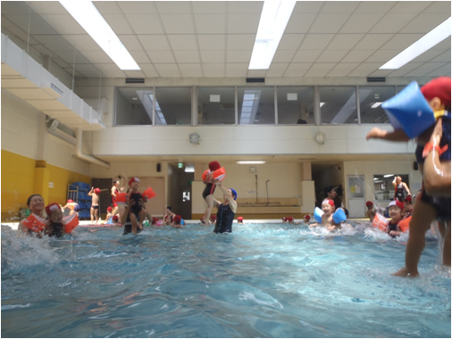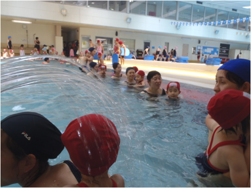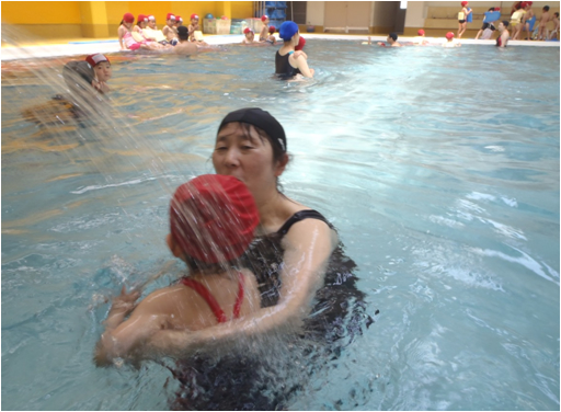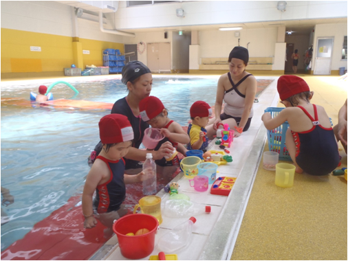 おうちの方と水かけ合いっこをして、楽しみながら水慣れしています。