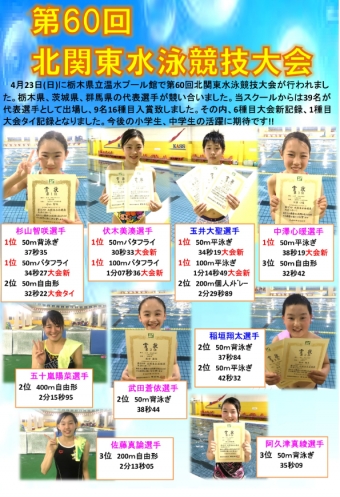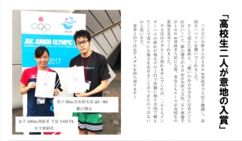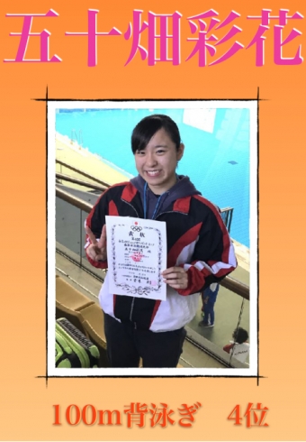 | 第40回全国JOCジュニアオリンピックカップ夏季水泳競技大会において、 <女子チャンピオンシップ100m背泳ぎ> ☆五十畑彩花選手☆ 1分03秒74 ★8位入賞★ <男子15~16歳50m自由形> ☆猿山翔太選手☆ 23秒83 ★5位入賞★ |