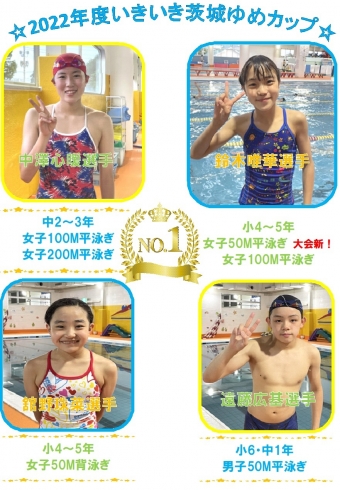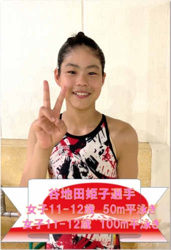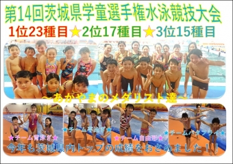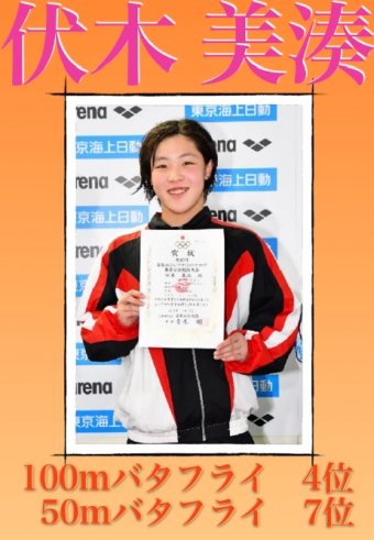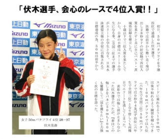 | 第40回全国JOCジュニアオリンピックカップ夏季水泳競技大会において、 <女子11~12歳50mバタフライ> ☆伏木美湊選手☆ 28秒97 ★4位入賞★ ☆★☆茨城県学童新記録樹立☆★☆ |