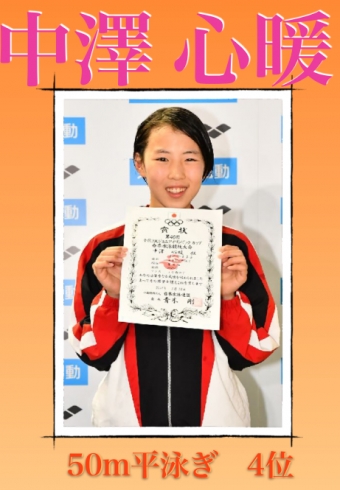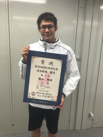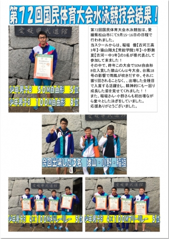 | 第72回国民体育大会において、 ☆猿山翔太選手☆ <50m自由形> 23秒84 ★5位入賞★ <100m自由形> 53秒61 ★8位入賞★ <4×100mフリーリレー> 3分32秒57 ★5位入賞★ <4×100メドレーリレー> 3分51秒22 ★5位入賞★ |