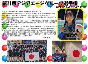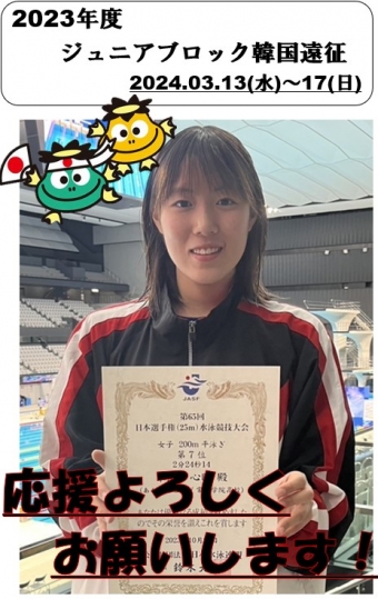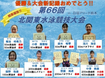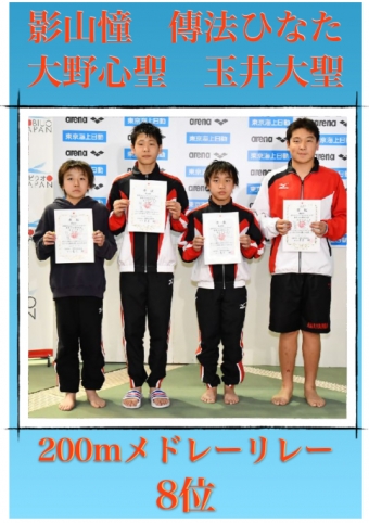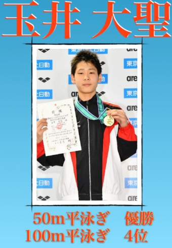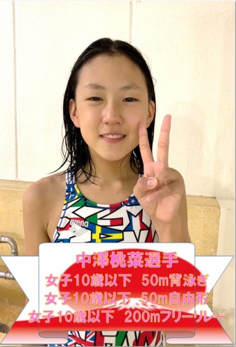 | 8月21日(日)~8月26日(金) 東京辰巳国際水泳場にておこなわれました!! 鈴木 唯華 女子 50M平泳ぎ 8位 小椋 凪紗 女子 50Mバタフライ 5位 女子100Mバタフライ 6位 中澤 心暖 女子100M平泳ぎ 5位 女子200M平泳ぎ 5位 |