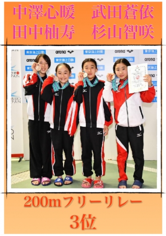 | 第40回全国JOCジュニアオリンピックカップ夏季水泳競技大会において、 <女子10歳以下4×50mメドレーリレー> ☆武田蒼依選手☆ ☆中澤心暖選手☆ ☆杉山智咲選手☆ ☆谷地田姫子選手☆ 2分18秒10 ★7位入賞★ |