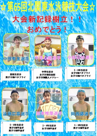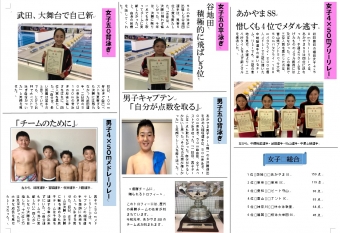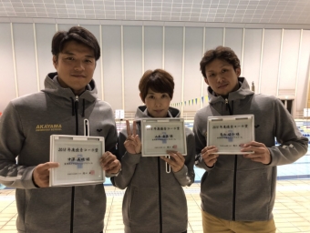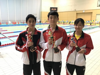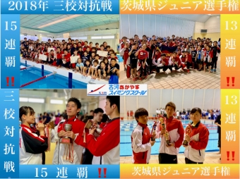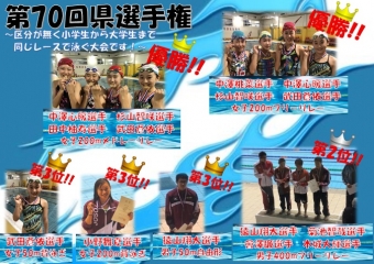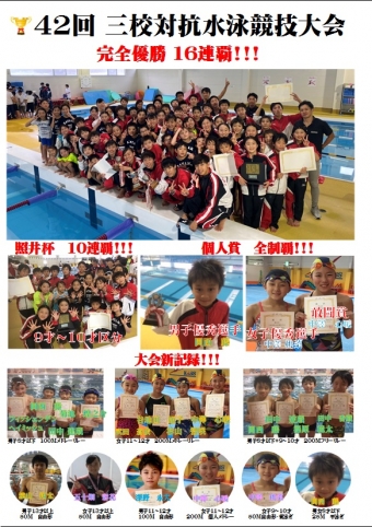 | 第41回三校対抗水泳競技大会において、 ★男子の部★ ★女子の部★ ★男女総合★ ★照井杯★ 15連覇達成!!! 敢闘賞 ☆和田稜太選手☆ 5回出場 ☆深野永大選手☆ ☆伏木和輝選手☆ ☆津田康平選手☆ ☆藤田春輝選手☆ ☆玉井大聖選手☆ ☆廣聡太選手☆ ☆二宮和祐選手☆ ☆大橋愛希選手☆ |